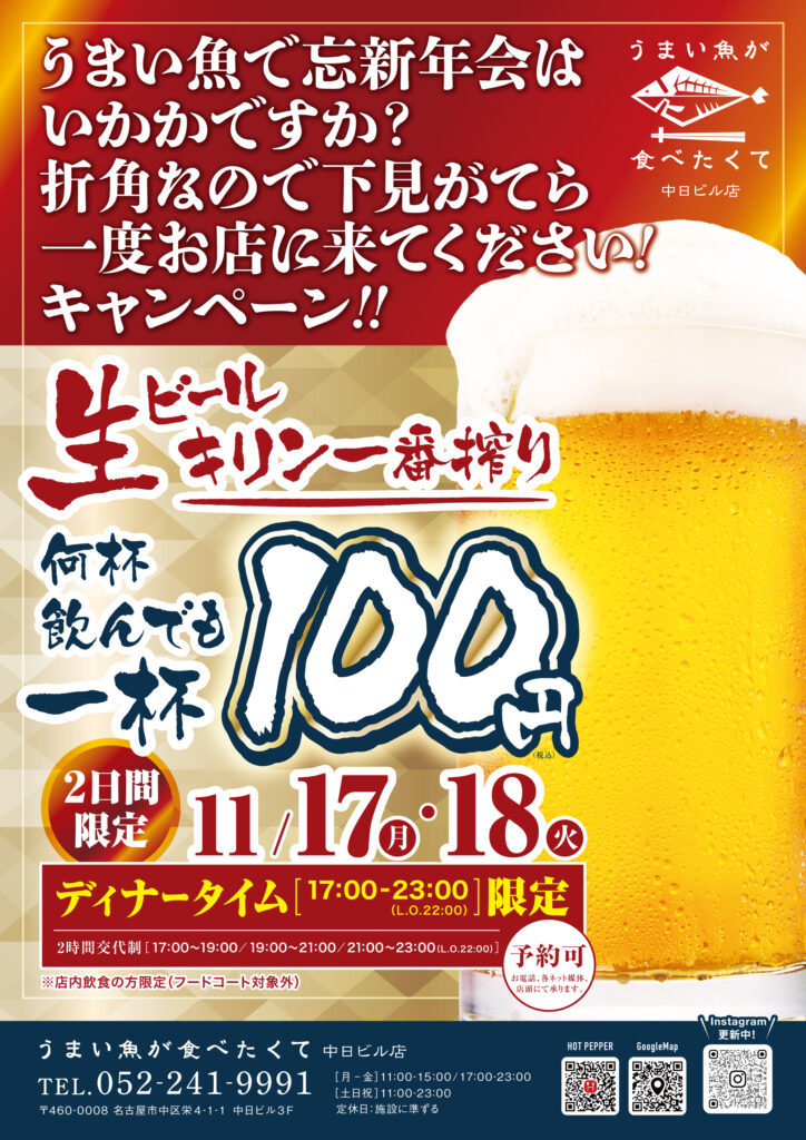 「うまい魚が食べたくて 中日ビル店」では11月17日(月)、18日(火)の2日間限定で、
