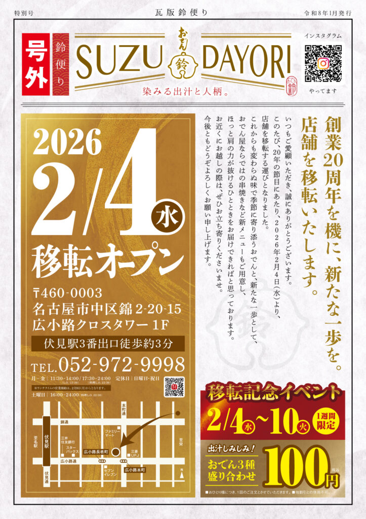 「おでん鈴」が創業20年の節目にあたり、2月4日(水)に店舗を移転オープンいたします!