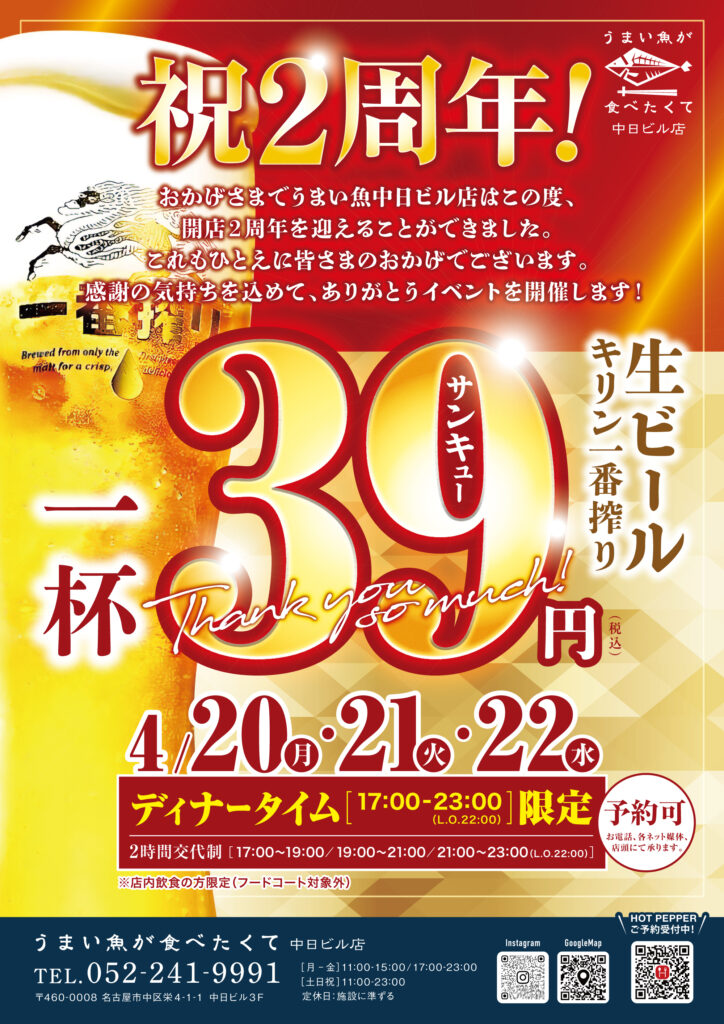 「うまい魚が食べたくて 中日ビル店」が4月23…